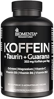 BIOMENTA Koffein – 180 Koffein Taurin Kapseln vegan mit 332 mg Koffein pro Tag, Guarana, Grüntee Extrakt, Magnesium, Vitamin C und B-Vitaminen