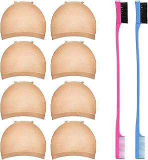Perücke Kappen Caps 8 Stück Nylon Perückenkappe Elastische Haarnetz mit 2 Stücke Haar Bürste Dopple Seitig Kontrolle Haar Bürsten Edges Brush für Damen (Beige)