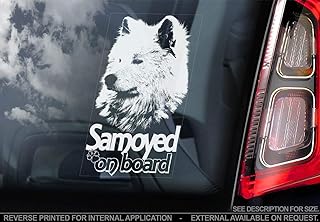 Samojed - Autoaufkleber - Hund Schild Fenster, Stoßstange Aufkleber Geschenk - V002 - Weiß/Klar - Interne Rückwärtsgang Aufdruck, 190x100mm